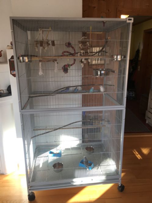 Stort fuglebur (Gd Victory med hjul, 100 x 76 x 182 cm, ny pris kr 3190 i 2015) med 6 undulater; 1 engelsk og 5 vanlige